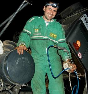 Přesně 41 kilometrů před cílem motor definitivně zhasl a my se ocitli v tichu pouště. Asi jsme si v tu chvíli plně neuvědomovali vážnost situace, protože jsme se co nejrychleji snažili jednat. Já jsem skočil do nástavby, uvolnil kanystry s olejem (máme dva) a ten, kde už bylo min než půl jsem vylil do písku. Pak jsme rozmontovali hadicí na huštění vaků, na kterých se zvedá auto, a byli jsme připraveni na to přečerpat si od někoho potřebných cca 4O litrů na dojetí.
